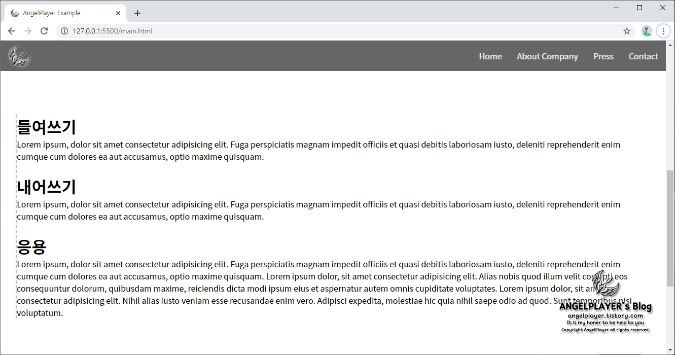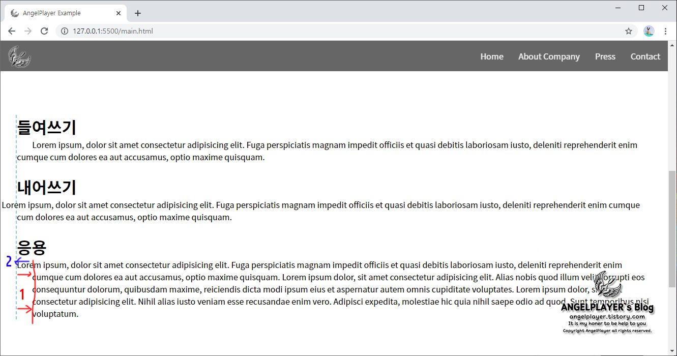 그리고 text-indent를 이용하여 한 줄만 내어쓰기를 해주면 아래와 같이 한 문단만 내어쓰기를 하면서 벽에 가려지는 현상을 막을 수 있습니다.