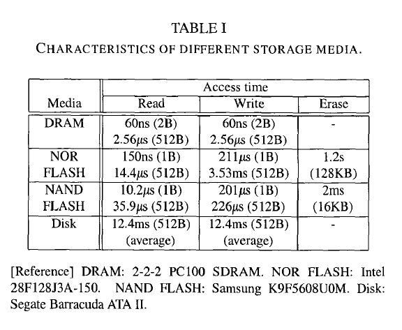 표 1은 플래시 메모리의 두 가지 주요 유형(NAND, NOR)을 포함한 다양한 스토리지 미디어의 특성을 비교
