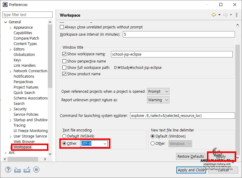 마찬가지 [Web] 하위에 있는 [HTML Files]로 이동하여 [Encoding] 방식을 [ISO 10646/Unicode(UTF-8)]로 변경하여 준 후 [Apply]를 눌러줍니다.
