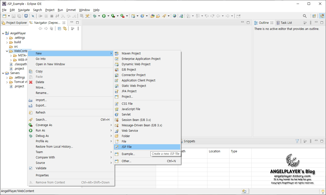 앞에서 만든 Dynamic Web Project를 열어 [WebContent] 디렉토리를 우클릭 한 후 [New] - [JSP File]을 클릭합니다.