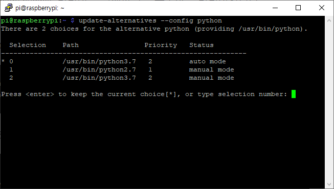 여기서 우리는 3.7이 기본으로 실행되기를 원하기 때문에 해당 버전을 가리키는 번호인 2를 입력합니다.