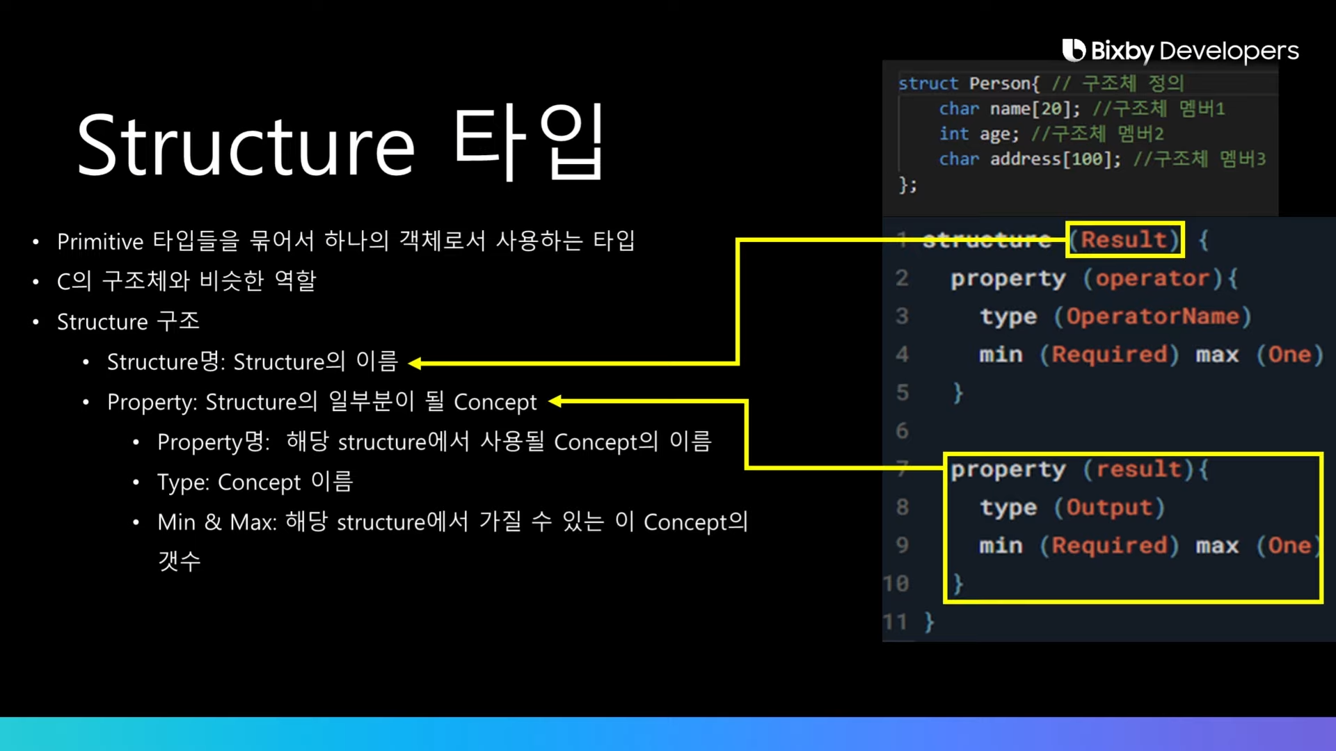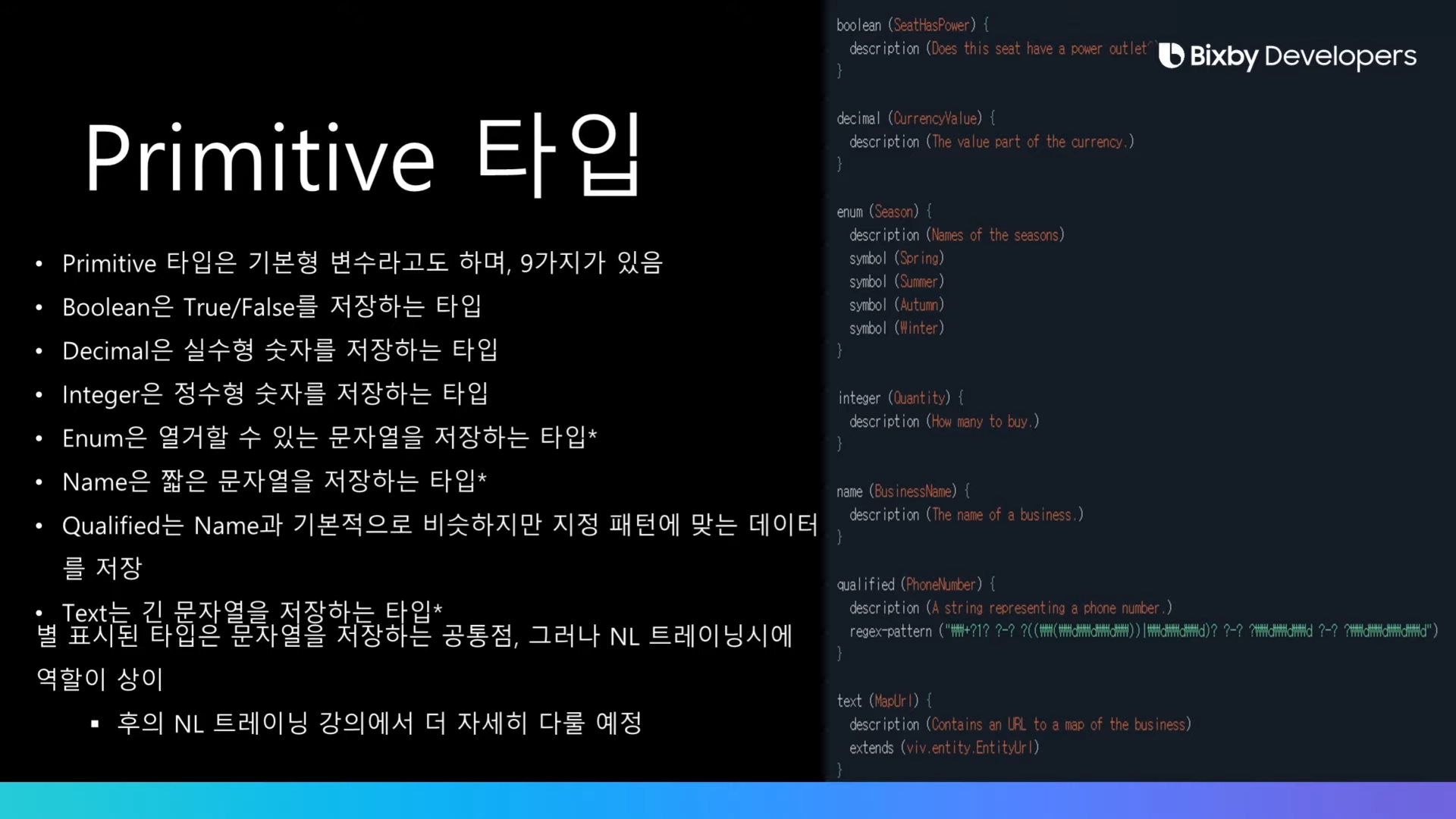 - Type : 엑션의 종류를 설정, 빅스비 시스템이 Action을 실행하기 위해 선택할 때 도움