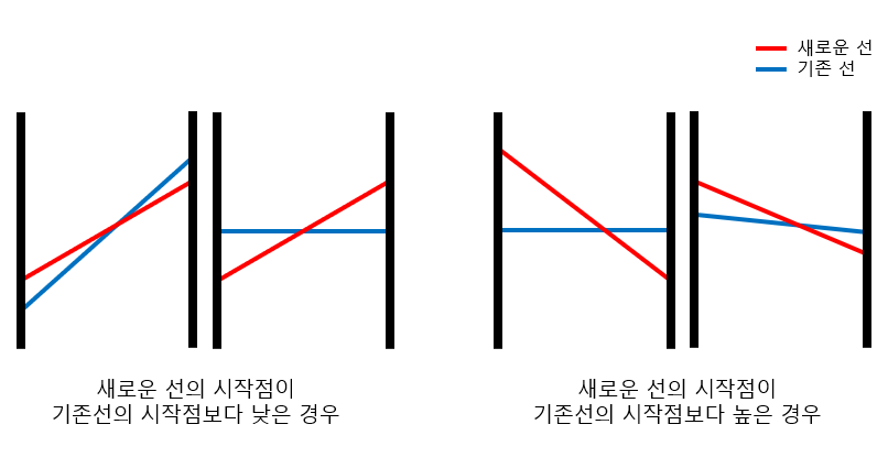 2. 새로운 선의 시작점이 기존선의 시작점보다 높은 경우, 새로운 선의 끝점이 기존선의 끝점보다 낮은 경우에만 교차점이 발생한다.