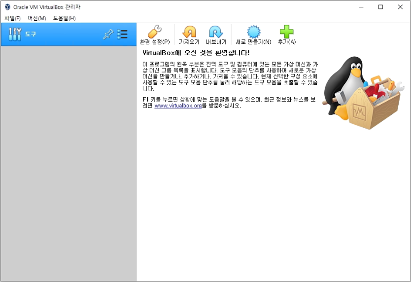 Virtual Box를 실행하여 중앙에 위치한 새로 만들기를 클릭합니다.