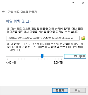 하드 디스크 크기 역시 적당하게 필요한 만큼의 크기를 지정하고 만들기를 클릭합니다.