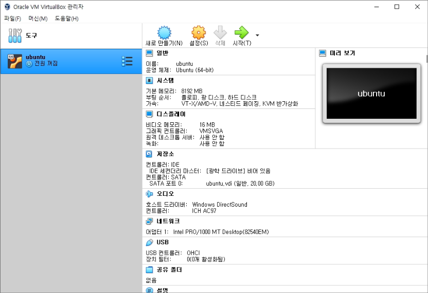 다시 가상 머신 화면으로 가서 시작 버튼을 클릭하면 가상 머신에 우분투 설치가 가능합니다.