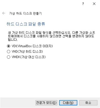 이어서 [VDI]를 선택한 후 다음으로 넘어갑니다.