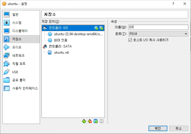 생성된 가상 머신을 선택한 후, [설정 - 저장소 - 컨트롤러 IDE - 광학드라이브 추가(왼쪽 CD 아이콘)]을 클릭하여 앞서 다운로드 받은 우분투 iso 파일을 선택합니다.