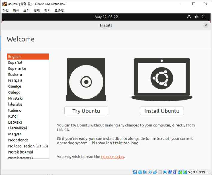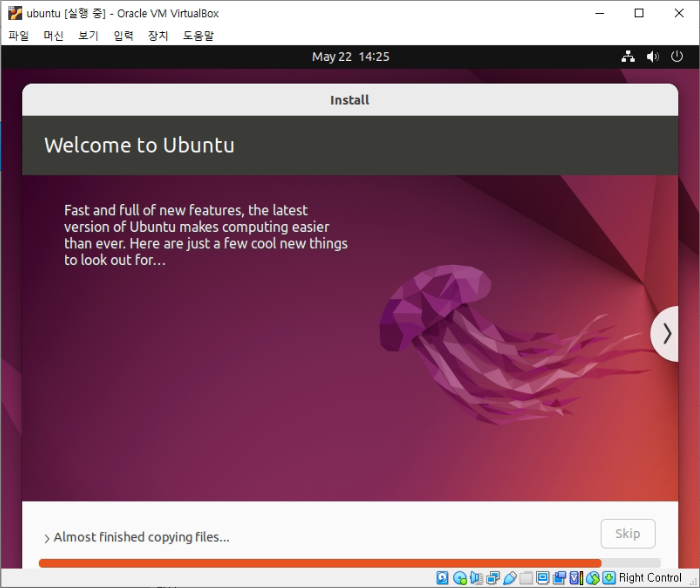 실행이 되면 가상 머신 위에 우분투 설치가 진행되는 것을 확인할 수 있습니다.
