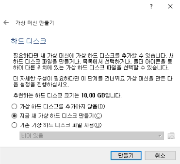 하드 디스크 영역은 [지금 새 가상 하드 디스크 만들기]를 선택한 후 넘어갑니다.