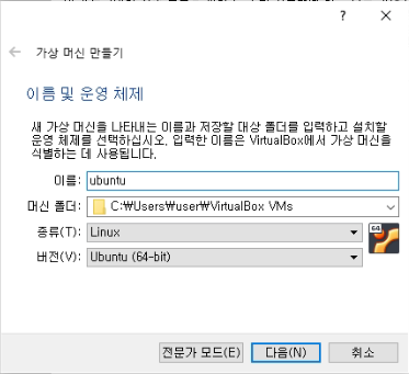 가상머신 이름 작성, 경로 설정, 종류를 Linux로 지정한 뒤 다음을 클릭합니다.