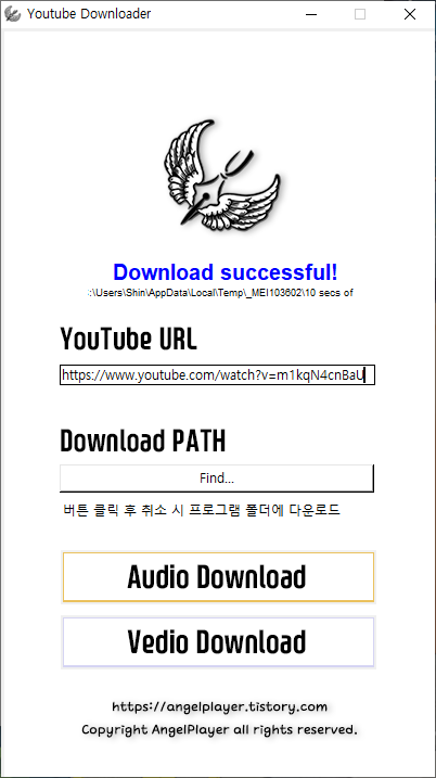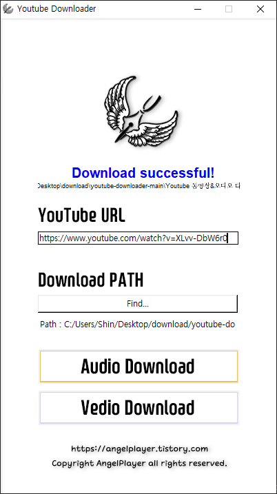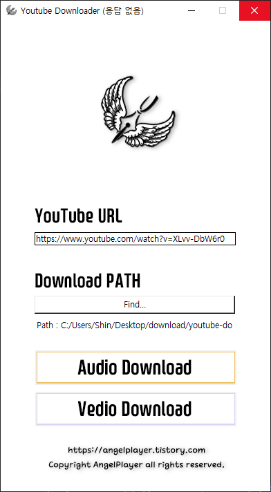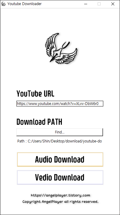 youtube_dl 라이브러리를 사용하여 구현한 Youtube 영상 또는 음원(소리, 노래) 다운로드 프로그램 입니다.