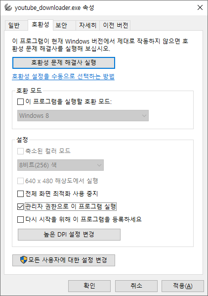 [youtube_downloader.exe] 파일을 [우클릭] 후 - [속성]을 클릭합니다.