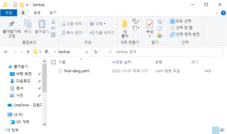 명령이 제대로 수행되었다면 CMD의 경로에 yaml 파일이 생성된 것을 확인할 수 있습니다.