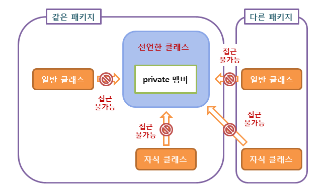 private : 외부에 직접 접근 불가, 클래스 내부에서만 접근 가능 -> 객체의 public 메소드를 통해서만 접근 가능