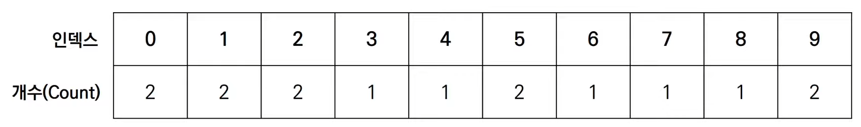 가장 작은 데이터부터 큰 데이터까지 담을 수 있는 리스트를 생성 후, 개수를 count하여 저장