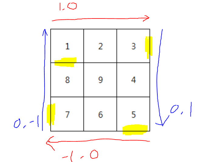 방향은 시계방향으로 계속 꺾이는 것을 확인 할 수 있으며, 꺾이는 조건과 꺾이는 방향 정보를 적절히 활용하여 문제를 해결할 수 있습니다.