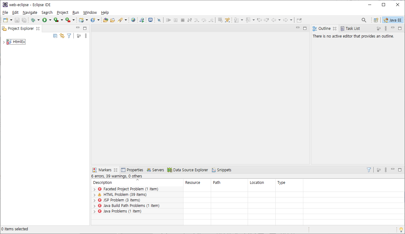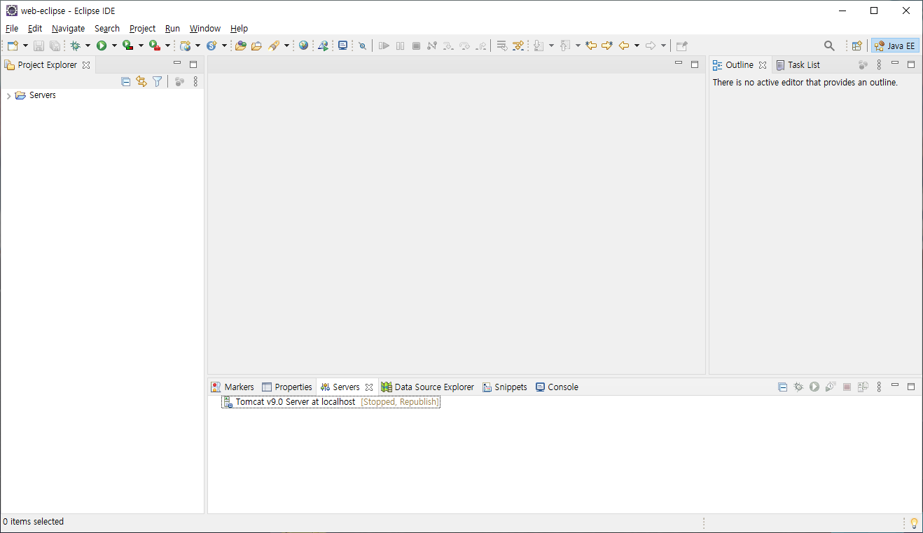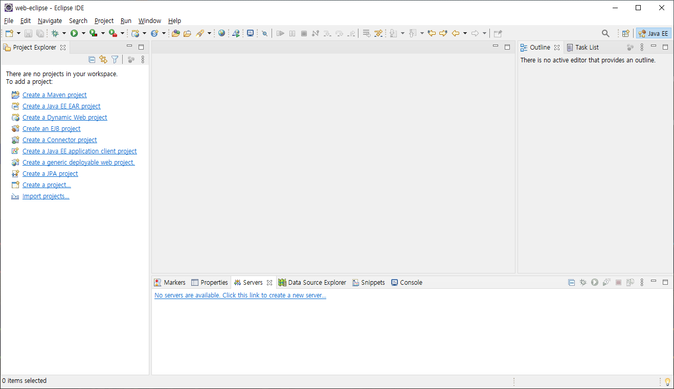 우측 위에 Java EE아이콘이 나타난다면 성공적으로 이클립스 EE 버전이 설치된 것입니다.