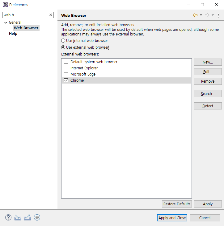 window - Preferences에서 Web Browser를 검색하여 기본 Default 값으로 되어있는 웹 브라우저를 Chrome 또는 원하는 브라우저로 변경합니다.