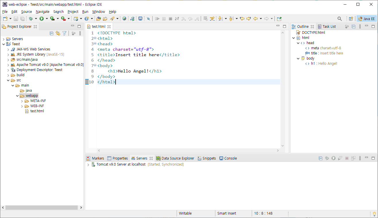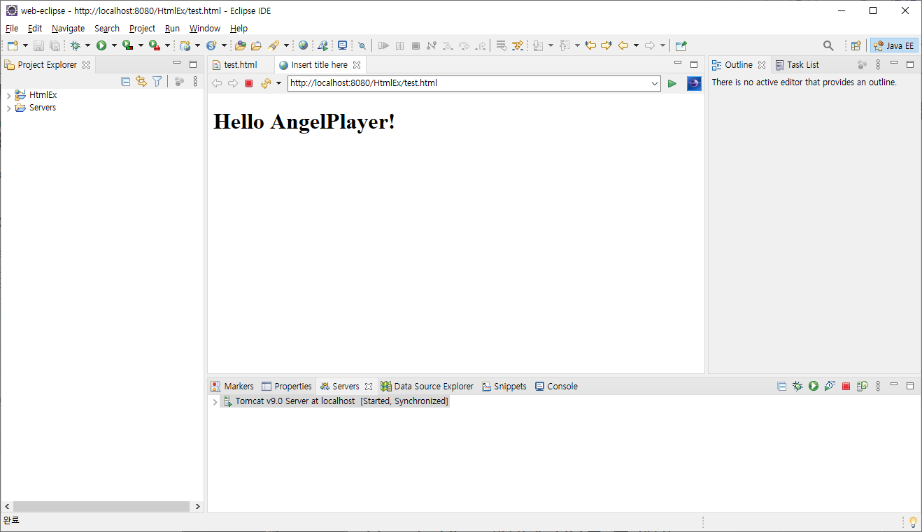 간단한 HTML 코드 작성 후 화면 우클릭 - Run As - Run on Server를 통해서 만든 파일을 브라우저 화면에 출력할 수 있습니다.