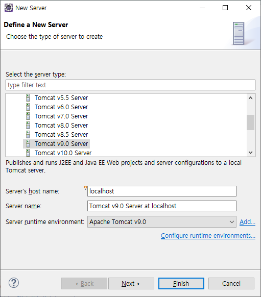 앞에서 설치한 톰켓 버전에 맞춰서 server type을 선택한 후 Finish를 눌러줍니다.