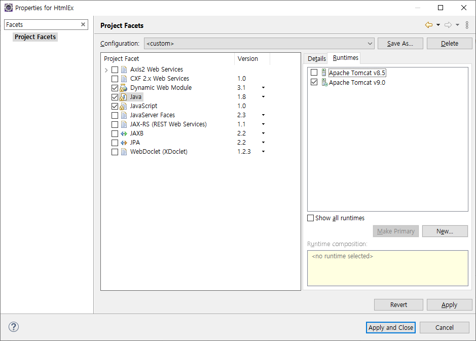 다음으로 우측 화면에 Runtimes에 지정되어 있는 Tomcat 버전이 현재 설치된 버전과 동일한지 확인합니다.
