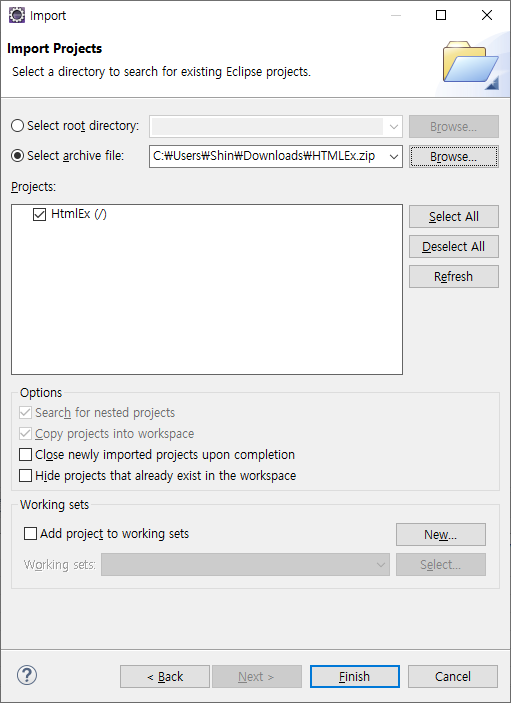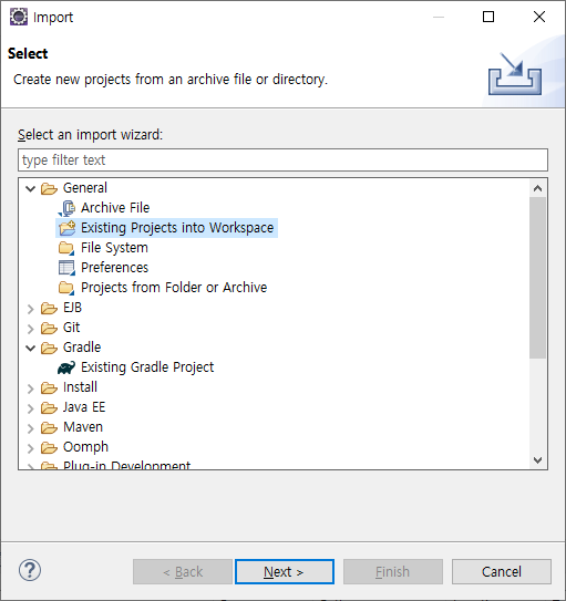 압축파일 혹은 압축이 풀려있는 프로젝트 파일의 경우 Existing Projects into Workspace를 통해서 가져올 수 있습니다.