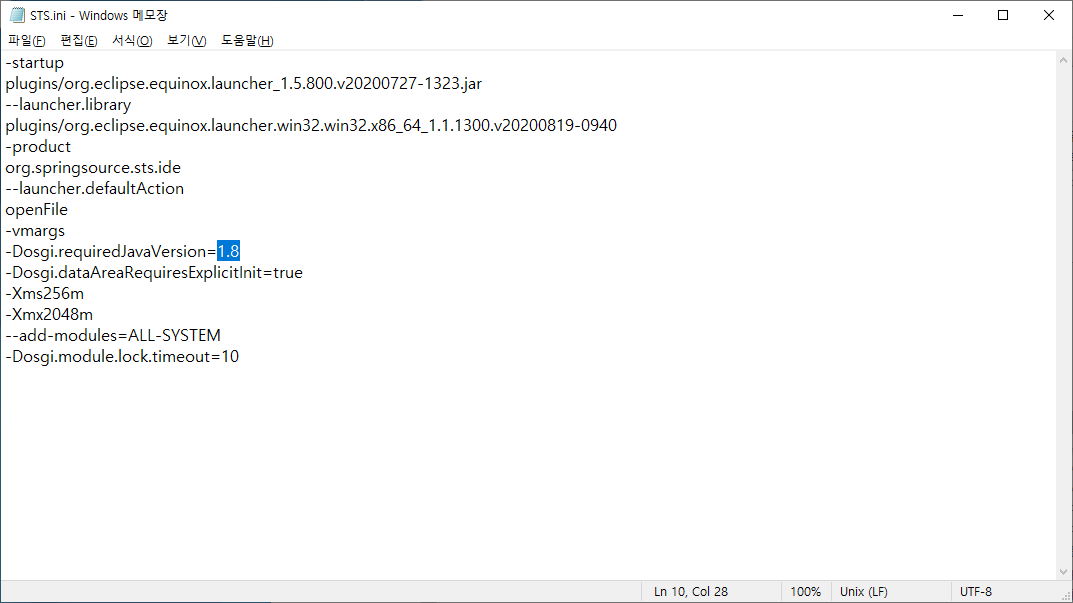 에러 해결을 위해서 STS.ini (이클립스의 경우 eclipse.ini)를 메모장 등의 텍스트 편집기로 열어줍니다.