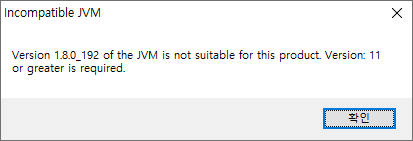 Spring을 위해서 STS를 다운로드 후 실행하였을 때 Incompatible JVM / Version 1.8.0_192 of the JVM is not suitable for this product. Version: 11 or greater is required 라는 에러가 발생하였습니다.