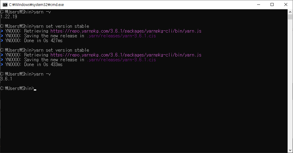 윈도우 환경에서 yarn을 최신 버전으로 설치하기 위해서는