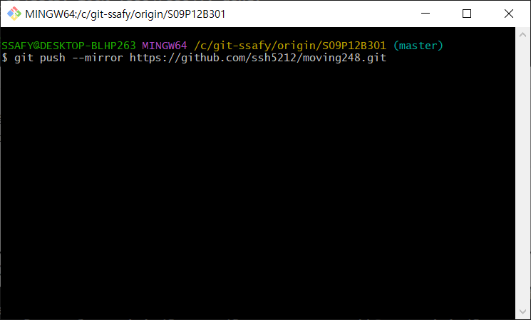 clone이 완료되면 [git push --mirror 미러링할_깃허브_주소]를 입력하여 줍니다.