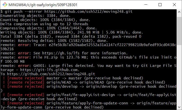 만약 미러링 도중 위와 같은 에러가 뜨고 정상적으로 미러링이 되지 않는다면 100MB 이상의 대용량 파일이 있으므로 올릴 수 없다는 뜻입니다.