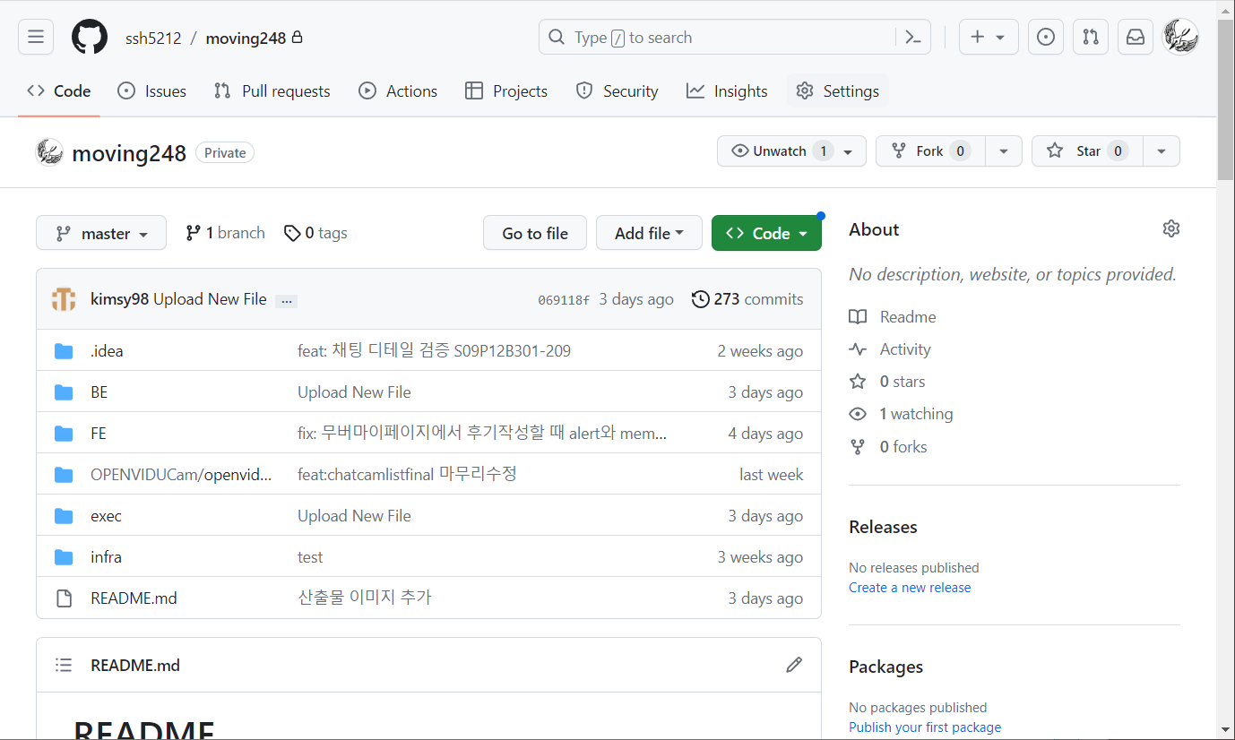 GitHub에 들어가면 GitLab에서 작성한 코드들이 그대로 미러링 된 것을 확인할 수 있으며, commit 내역도 함께 유지되어 있는 것을 확인할 수 있습니다.