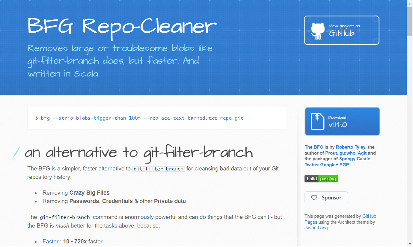 $ bfg --strip-blobs-bigger-than 100M --replace-text banned.txt repo.git an alternative to git-filter-branch The BFG is a simpler, faster alternative to git-filter-branch for cleansing bad data out of your Git repository history: Removing Crazy Big Files Re