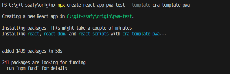 $ npx create-react-app 프로젝트명 –template cra-template-pwa