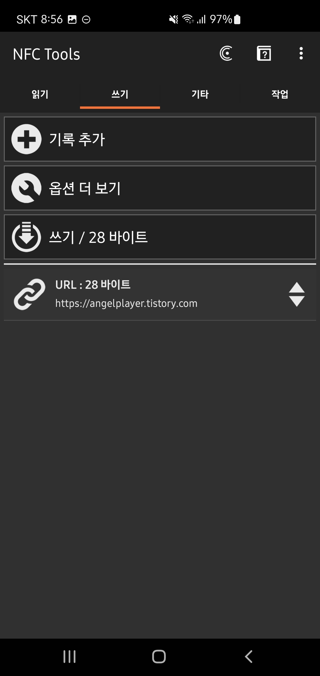 NFC 쓰기는 다양한 방법으로 가능하지만, 시중에 배포된 어플리케이션을 통해서 쓰는 것이 가장 간단한 것 같습니다.