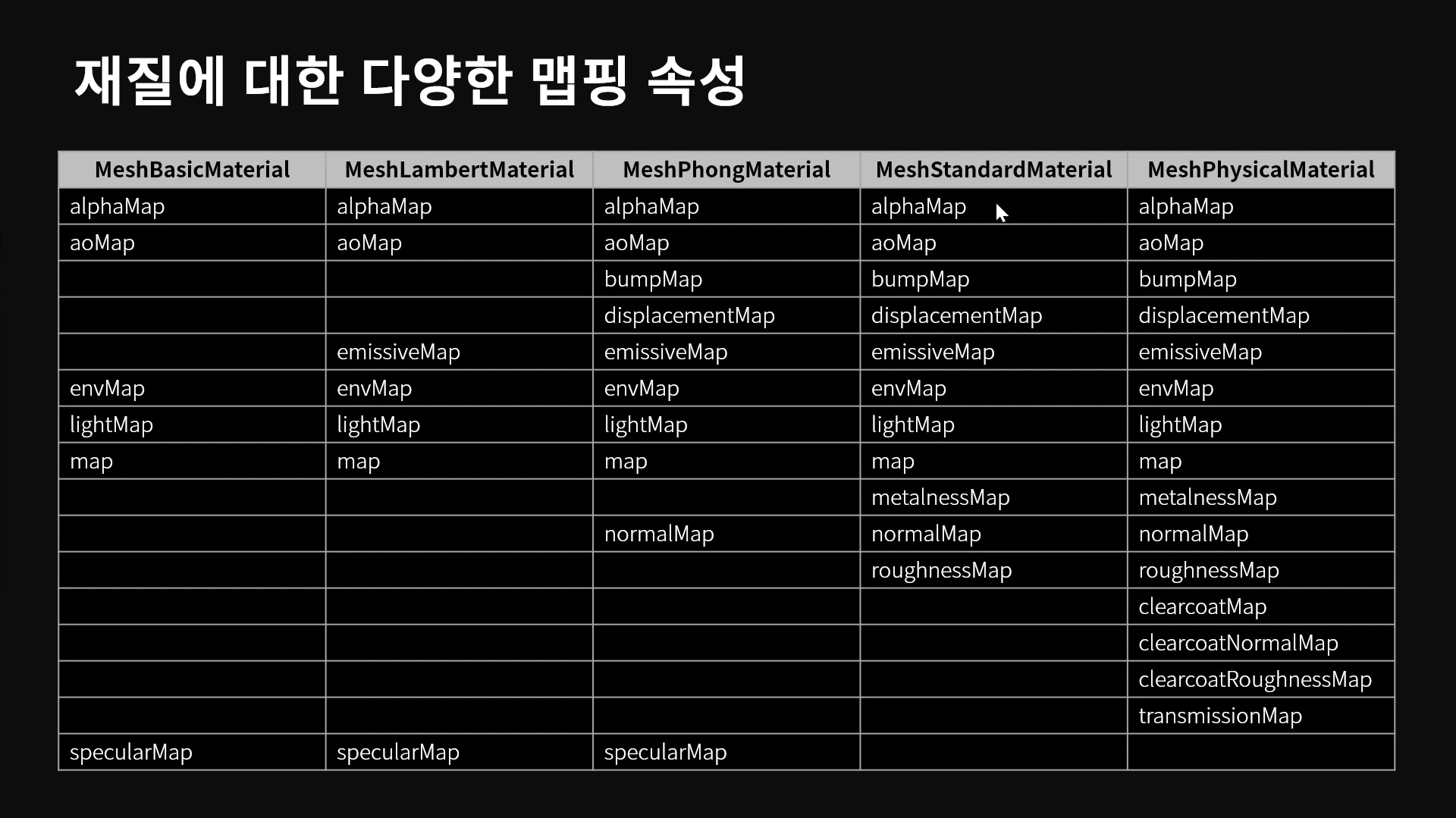 displacementMap : 실제 재질의 높낮이를 변경함 (normal과의 차이점)