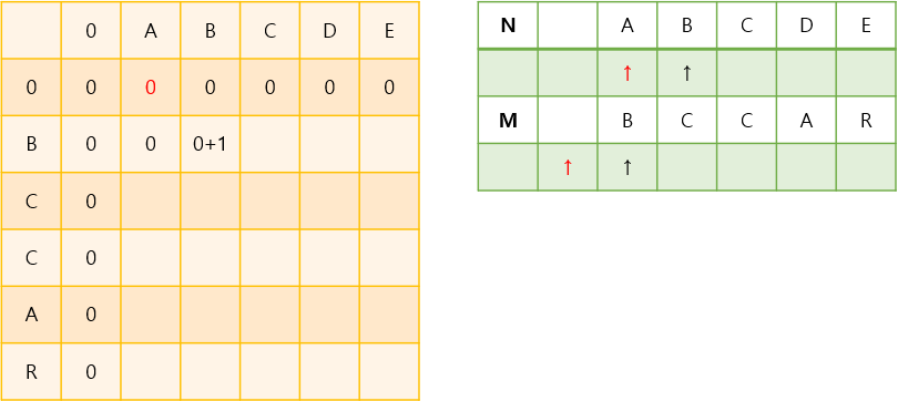 위와 같이 문자열 비교 시 첫 문자의 앞에 대한 정보를 저장하기 위해서 dp의 길이를 N + 1, M + 1로 하고 맨 첫번째 줄은 0으로 초기화 해둔 것입니다.