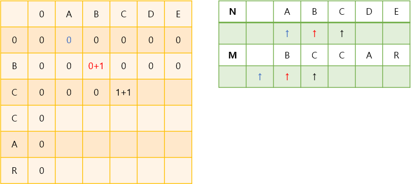 이 때, ABCDE 와 BCCARD 각각이 가지는 부분 문자열 중 동일하게 포함하는 가장 긴 부분 문자열을 찾는 문제입니다.