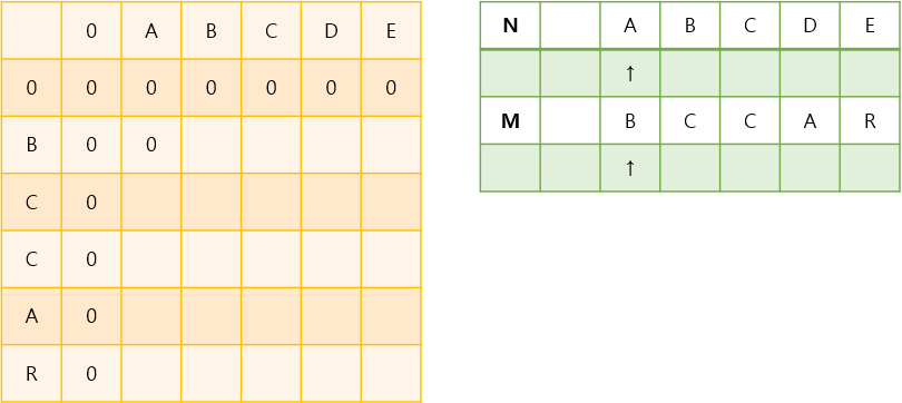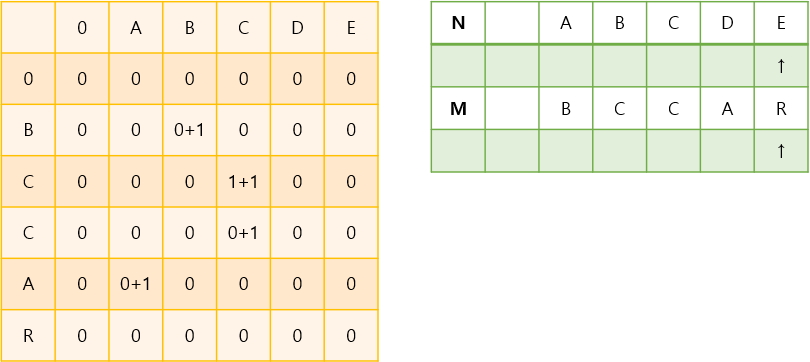 N(i)과 M(j)의 글자를 하나씩 비교하면서 두 문자가 다를 때 dp[i][j]에 0을 넣습니다.