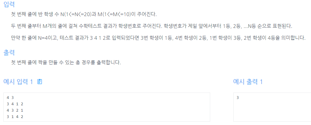 3 4 1 2가 점수와 같은 느낌으로 봤는데 (첫 번째 줄 케이스에서 학생1은 3점, 학생 2는 4점..) 알고보니 각 열이 등수이고, 해당 열에 값이 학생이었다.