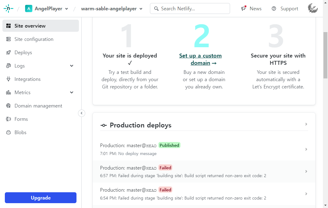 모든 설정을 마치면 사이트에 대한 overview 화면으로 이동하게 되는데, Production의 결과가 Published가 나오면 정상적으로 배포가 완료된 것입니다.
