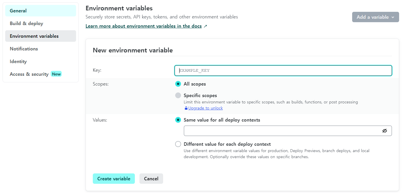 env에 작성한 변수를 추가하는 방법은 Site configuration에서 Environment variables에서 Add a variable을 누른 후,