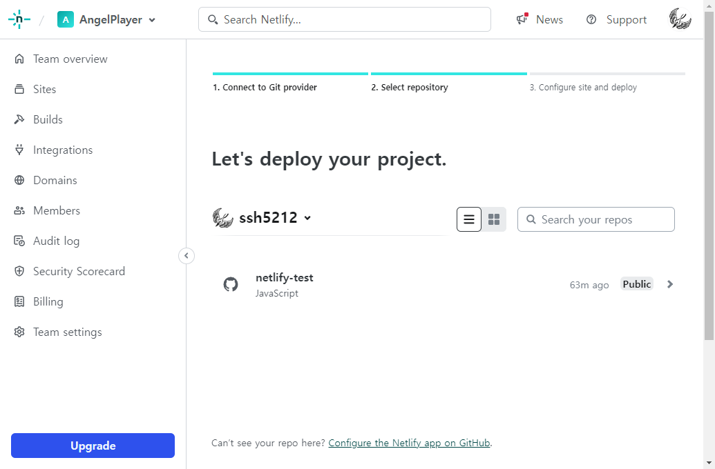 다시 돌아오면 선택한 Repository가 Netlify 화면에 잘 출력되는 것을 볼 수 있습니다.