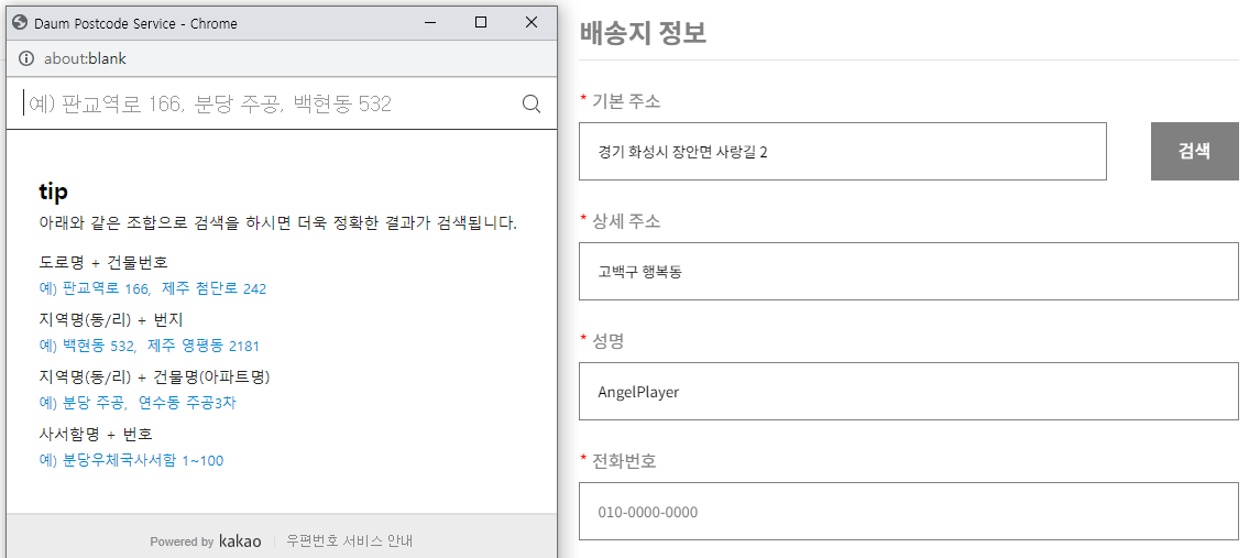 주소 및 우편번호(postcode) 검색 기능 구현