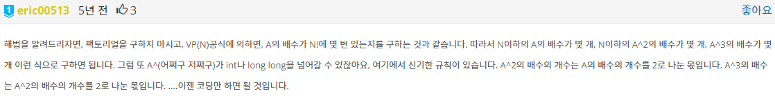 즉, a, a^2, a^3, ... 과 같이 a의 제곱수에서 각각 몇 개의 수가 나누어 떨어지는지를 확인하고 이를 더하면 정답을 찾을 수 있습니다.