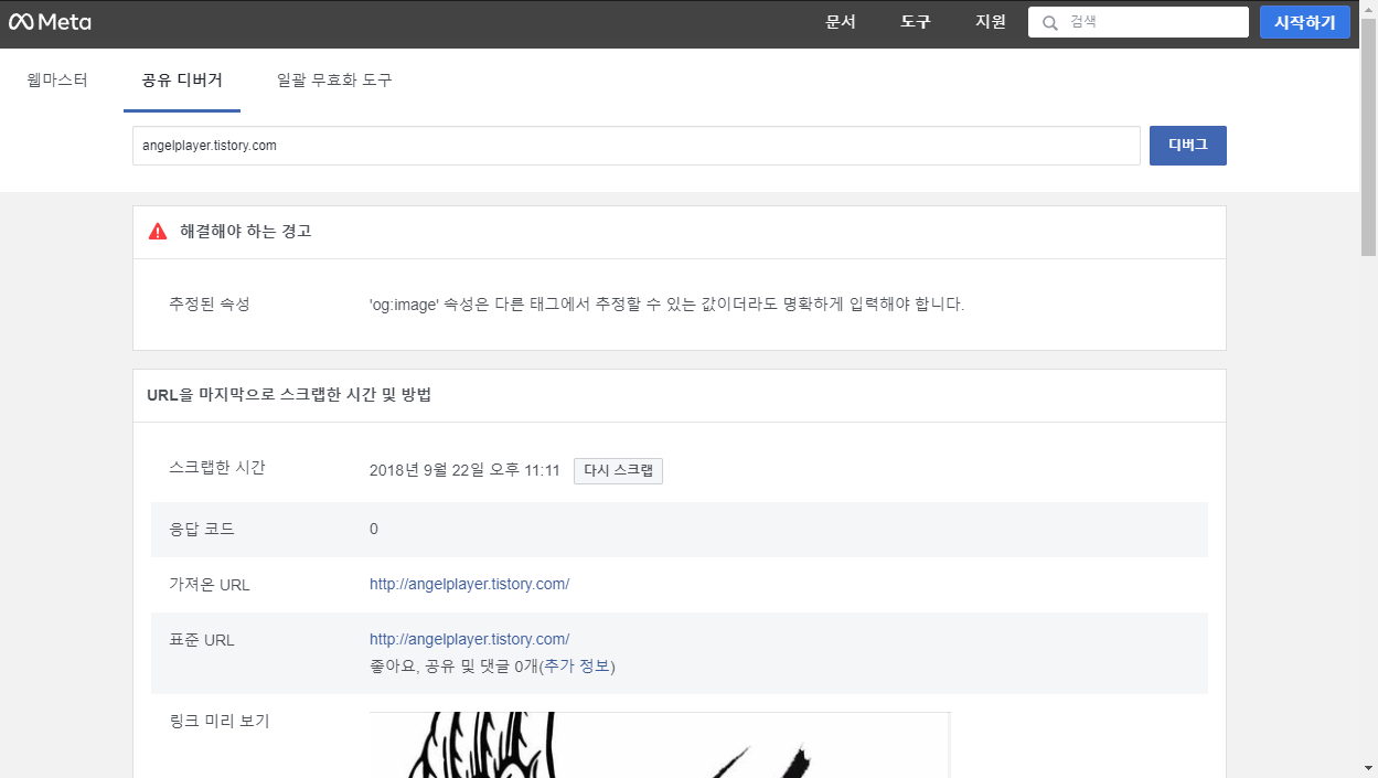 페이스북 개발자 도구에서 공유 디버거에 배포한 사이트의 주소를 입력하고 디버그를 클릭하면, 소셜 미디어에서 링크가 어떤식으로 출력되는지를 바로 확인하실 수 있습니다.