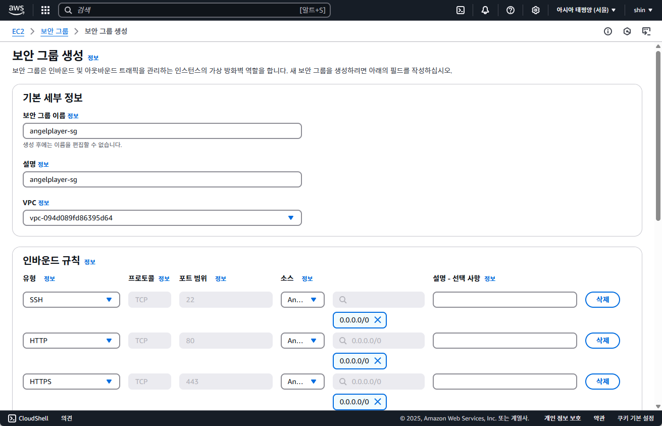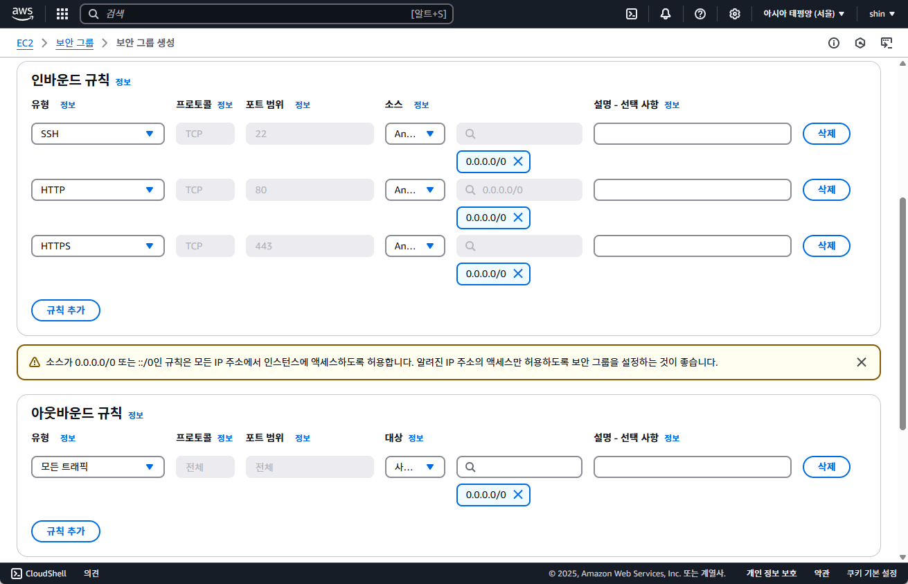 ※ SSH(포트 22)는 보안상 내 IP로만 접근을 허용하는 것이 안전합니다.