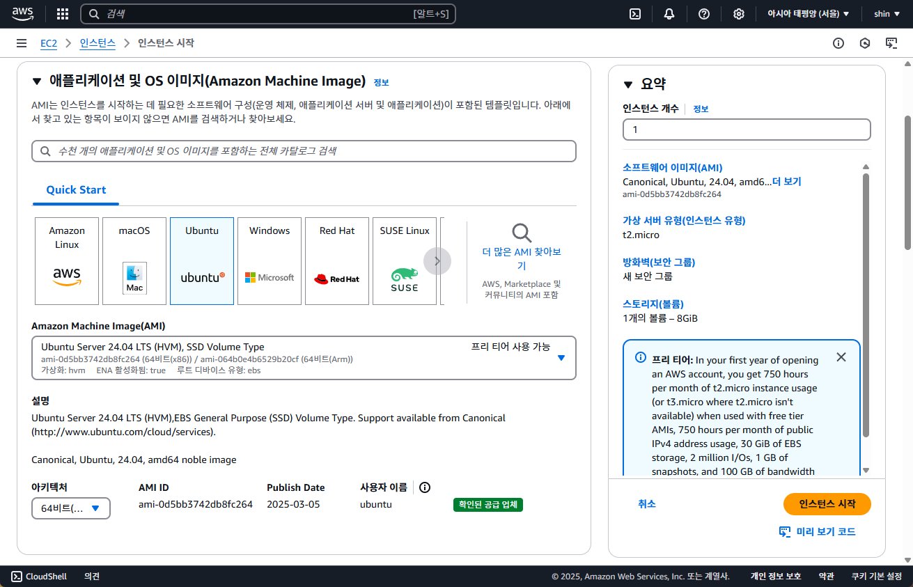 저는 우분투 24.04 버전을 선택하였으며, 인스턴스 생성 시점에 LTS(Long Term Support)가 붙어 있는 버전을 사용하시면 됩니다.