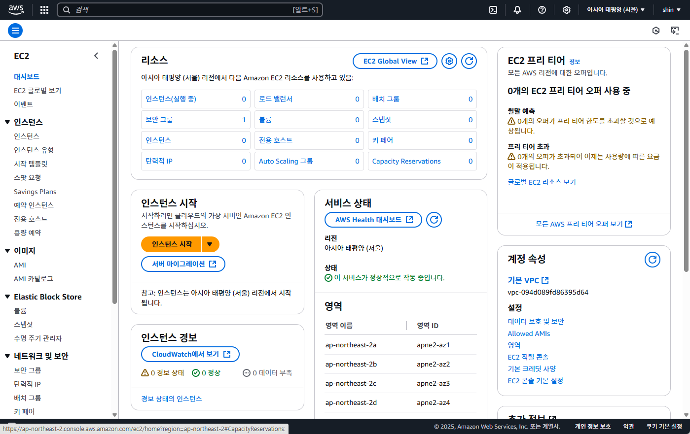 EC2의 대시보드 화면에서 인스턴스 시작을 눌러줍니다.
